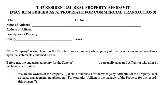 The T-47 is a Residential Real Property Affidavit. It’s a notarized document that tells the buyer what the seller knows about the home’s boundaries.